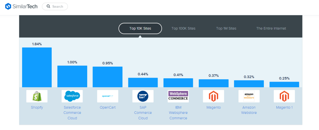 Shopify is the first used e-commerce platform among the top 10,000 sites on the internet according to similartech . In 2020, the Canadian e-commerce CMS was honored as the eCommerce Data Quadrant Award Winner by SoftwareReviews.